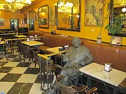 From the 1980s until now it recovered its bygone splendor as has the University of Salamanca and the city. The 25 years that Gonzalo Torrente Ballester enjoyed in the city and frequenting the café, helped to return the real position of Café Novelty to a position of meaningful influence in the cultural life.[7] The trace of the writer in Café was so significant that in 2000 one monument was inaugurated in memory of the Spanish professor and author. It is a statue sited in his favorite corner of Café made by one friend of the writer' sculptor Fernando Mayoral.[8] At the present time it has privileged position in the city and still is being the favorite place of meeting of artists, writers, politicians and businessmen. One of the frequenters is the president of the Royal Spanish Academy Victor Garcia de la Concha, the basque writer Juan Manuel de Prada, the Mexican author Jorge Volpy and the poet Paco Novelty.