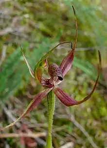 Kangaroo Island spider orchid occurs on Kangaroo Island and the Fleurieu Peninsula where it grows singly or in small clumps in thick scrub, often in association with Eucalyptus viminalis.[2][3][7]