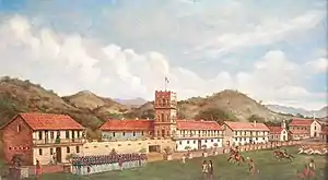 In 1769, Gaspar de Portolá and less than two hundred men, on expedition founded the Presidio of San Diego (military post). On July 16, Franciscan friars Junípero Serra, Juan Viscaino and Fernando Parron raised and 'blessed a cross', establishing the first mission in upper Las Californias, Mission San Diego de Alcalá.[17] Colonists began arriving in 1774.