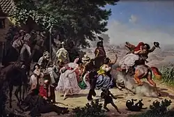On January 11, 1847, General Jose Maria Flores turned over his command to Andrés Pico and fled. On January 12, Bernarda went alone to Pico's camp and told him of the peace agreement she and Fremont had forged. Fremont and two of Pico's officers agreed to the terms for a surrender, and Jose Antonio Carrillo penned Articles of Capitulation in both English and Spanish.[33] The first seven articles were almost entirely from Ruiz's suggestions. The story of Bernarda Ruiz is based largely on two short paragraphs and a footnote in Fremont's memoirs, first published in 1887.[34] Many aspects of the story cannot be verified in primary source materials.[35]