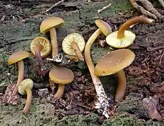 The caps are brownish, as are the stipes, which are fibrillose and hollow, with yellowish tomentum near the base.[5] The spores are colorless but produce a yellow color in ammonia.[5]