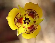 Atop the stem is a lily bloom with sepals up to 4 centimeters long. The petals are up to 5 centimeters long and yellow with a darker line or series of bands near the base, which are often red. The cup of the flower is filled with hairs which have clubbed ends. The anthers are often deep purple.[2]