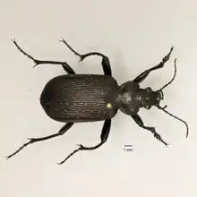 Calosoma sayi, also known as "Say's caterpillar hunter or "Black Caterpillar Hunter",[1] [2] is a species of ground beetle of the subfamily Carabinae.[3] It was described by Pierre François Marie Auguste Dejean in 1826.[3] A large, lustrous black beetle found throughout the United States, its habitat is fields and disturbed areas. About 25mm to 28mm long, its grooved elytra have rows of metallic dots or pits. Said pits are smaller than many Calosoma, and are ruby red. Both larvae and adults prey upon other larvae and pupae, specifically those of grubs, flies, and lepidoptera.[2]