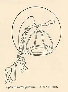All Siphonophores including Calycophorae are composed of zooids, which each have a function within the organism including but not limited to feeding, reproduction, and locomotion.[1] The body plan of a Calycophorae can be divided into its nectophore and its siphosome.[2] A typical Calycophorae has two nectophores that have ostiums that are either facing the opposite or same directions.[2] For aligned nectophores, the nectophores are classified as anterior and posterior with the latter being the one behind.[2] Within the nectophore are the somatocyst and the hydroecium.[2] The somatocyst is an additional structure that is seen in the mesoglea of Calycophorans where oil globules are stored as a food source and also serve to provide buoyancy.[2] The hydroecium is a ventral cavity that exists in the posterior nectophore.[2] The siphosome is the stem of the Calycophoran on which the bracts, gastrozooids, and gonophores are attached to with the bracts serving as a protective cover.[1][2] The bracts also contain a phyllocyst that also contains oil globules.[2] Each group of these zooids is called a cormidium and repeats itself throughout the siphosome.[1][2] Each gastrozooid has an elongated tentacle that has several side tentacles called tentilla that have pads or batteries of nematocysts which are connected to the tentacle by a pedicel.[2] There are some exceptions to this common morphology such as the Hippopodiids that have several overlapping nectophores and Sphaeronectids that have one nectophore.[2]