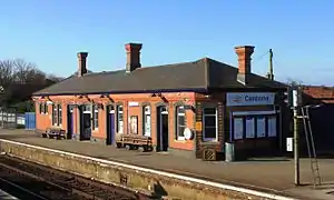 The station buildings have been replaced by some in the style used by the Great Western Railway circa 1900. The railway was originally just a single track with a passing loop in the station. In 1895 a second line was laid to the east, and in 1900 to the west. Goods sidings were originally laid on both sides of the station, with a goods shed behind the westbound platform. The sidings on the north side of the station were removed in 1937 which allowed the eastbound platform to be lengthened. The sidings on the south side, along with the goods shed, were taken out of use in 1965 and this platform was also extended in 1980.[3]