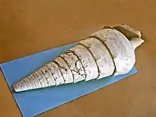 | Fossil shell of Campanile auvertianum from France, on display at Galerie de paléontologie et d'anatomie comparée in Paris | |