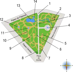 Its origin as a park or, more specifically, as a garden area, dates back to 1787, although from the fifteenth century it was regarded as an important urban space.[2] A notable feature of the park is the large and diverse birds. Spread over the surface lies a Faisanera, an aviary and a loft belonging to Castilla Pigeon Club, which have led to significant populations of peacocks, pheasants and pigeons. It also has a variety of trees that makes it a true botanical garden.