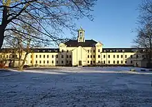 Campus Konradsberg is named after the psychiatric hospital Konradsberg which was erected 1855–1871[1] based on plans by the architect Albert Törnqvist and is thereby the oldest building in the area. Fredhälls folkskola, drawn by Paul Hedqvist, is located to the far left on Campus Konradsberg and was inaugurated in 1938. In the 1950s, additional school buildings were added to the elementary school. Konradsberg was used for psychiatric care until 1995.