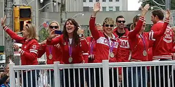 Former backstroke swimmer and 1992 Summer Olympics gold medallist Mark Tewksbury was the nation's chef de mission, while former diver and 1984 Summer Olympics gold medallist Sylvie Bernier became an assistant chef de mission.[10] Triathlete and double Olympic medallist Simon Whitfield was the nation's flag bearer at the opening ceremony.[1]