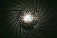The French 75 introduced a new concept in artillery technology: rapid firing without realigning the gun after each shot.[6] Older artillery had to be resighted after each shot in order to stay on target, and thus fired no more than two aimed shots per minute. The French 75 easily delivered fifteen aimed rounds per minute and could fire even faster for short periods of time, but the long-term sustained rate was 3-4 rounds per minute as more than this would overheat the barrel.[7] This rate of fire, the gun's accuracy, and the lethality of the ammunition against personnel, made the French 75 superior to all other regimental field artillery at the time. When made ready for action, the first shot buried the trail spade and the two wheel anchors into the ground, following which all other shots were fired from a stable platform. Bringing down the wheel anchors tied to the braking system was called "abattage". The gun could not be elevated beyond eighteen degrees, unless the trail spade had been deeply dug into the ground; however, the 75 mm field gun was not designed for plunging fire. The gun could be traversed laterally 3 degrees to the sides by sliding the trail on the wheel's axle. Progressive traversing together with small changes in elevation could be carried out while continuously firing, called "fauchage" or "sweeping fire". A four-gun battery firing shrapnel could deliver 17,000 ball projectiles over an area 100 meters wide by 400 meters long in a single minute, with devastating results. Because of the gun's traversing ability, the greater the distance to the enemy concentration, the wider the area that could be swept.