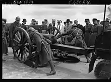 The U.S. Army adopted the French 75 mm field gun during World War I and used it extensively in battle. The U.S. designation of the basic weapon was 75 mm Gun M1897.[25] There were 480 American 75 mm field gun batteries (over 1,900 guns) on the battlefields of France in November 1918.[26] Manufacture of the French 75 by American industry began in the spring of 1918 and quickly built up to an accelerated pace.[26] Carriages were built by Willys-Overland, the hydro-pneumatic recuperators by Singer Manufacturing Company and Rock Island Arsenal, the cannon itself by Symington-Anderson and Wisconsin Gun Company. American industry built 1,050 French 75s during World War I, but only 143 had been shipped to France by 11 November 1918; most American batteries used French-built 75s in action.