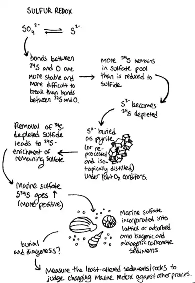 Interpreting the sulfur isotope composition of CAS can be complex. As discussed above, if seawater sulfate at a particular horizon in the geologic record gets heavier (i.e. more enriched in 34S relative to seawater sulfate before it) that could mean that the 34S-depleted products of sulfur-reducing reactions are being buried as sulfide minerals and removed from the oceans, possibly because of an instance of ocean anoxia[61][62][63] or an increase in dissimilatory sulfate reduction by marine microorganisms. But it could also mean that the CAS measured at that particular horizon was derived not from seawater sulfate at the time of carbonate deposition, but from fluids moving through the sediment or porous rock from a later time, in which sulfate could have been enriched by processes in a more oxidizing world. It could mean that there is a hitherto uncharacterized kinetic isotope effect associated with the incorporation of sulfate into a particular carbonate texture (shrubs vs. nodules vs. acicular cements vs. other conformations). Distinguishing between the effects of true changes in ancient ocean dynamics/chemistry and the effects of early- and late-stage diagenesis on CAS isotope composition is possible only through careful analyses that: compare the CAS record to the seawater sulfate record preserved in evaporites and marine barite, and carefully screen samples for their thermodynamic stability and evidence of alteration.[3][64][4] Such samples could include brachiopod shell fragments (which are made of stable, low-Mg calcite that visibly resists alteration after cementation).[4][65][66][8][67]
