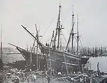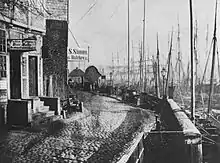 Photograph by Höge: dock port of Hamburg, Germany. Repair work on wooden ships, c.1865.