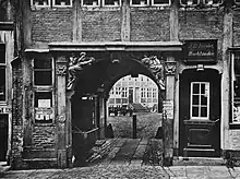 Photograph by Höge: View of a bookbinder's shop at number 124, Steinstraße looking through to the Jakobikirchhof, Hamburg. The carved archway is now preserved at the Museum of Hamburg History.
