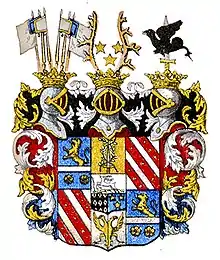 Coat of arms of Count Rehnskiöld. The predominant piece of the escutcheon is a running reindeer. Above it, an upright sword surrounded by laurel wreaths, symbolizing the victory at Fraustadt.[59]