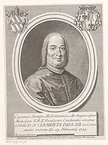 On 6 May 1737 Carlo Gaetano Stampa was appointed Archbishop of Milan, however he entered in Milan in private form only in July 1738 and he made his formal entry in the town on 10 May 1739.[5] On 23 February 1739 he was appointed Cardinal Priest of Santi Bonifacio e Alessio.[1] He participated to the Papal conclave of 1740, which lasted from February to August.[5]
