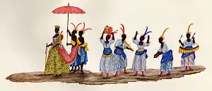 The painting on the top right, is called "The Queen and Her Suite." This picture above has nothing do with shown costumes. This was a parade that was being held in Brazil in the King and Queen of Brazil in their honours. Carlos Julião attended drawing classes which prepared Portuguese officers assigned around the empire to collect visual information about the peoples and territories colonized by the Portuguese. For six years, Julião served in India and illustrated a manuscript called "Noticia Summária do Gentilismo na Ásia", where with drawings and texts he reproduced Hindu beliefs of Brahman tradition.[9] These images are included in the catalogue "Riscos Iluminados de Figurinhos de Negros e Brancos dos Uzos do Rio de Janeiro e Serro Frio" maintained by the National Library in Rio de Janeiro, which was published in 1960. The title of the catalogue refers to 43 watercolor drawings portraying indigenous, military, costumes, slaves and their activities including diamond mining. Ethnographic representations of colonial Brazil; an ethnographic record of great utility to the authorities that run the empire. In the same catalogue are also included 33 drawings of Peruvian indigenous ceramic objects and textiles, confiscated from a Spanish shipwreck at Peniche in Portugal.[10] On the back of these drawings, there are watercolor sketches representing the culture of Portugal's central plateau where Peniche is located. The three groups of illustrations related to India, Brazil and Peru were published in 1960 by the National Library but they were already property of the institution since 1947, after they were acquired from an anonymous seller, residing in the United States. Its publication in 1960 commemorated the 500th anniversary of Prince Henry, the navigator along with various events and publications which happened that year simultaneously in Portugal and Brazil. Less known but also published that year in the exhibition catalogue "Engenharia Militar no Brasil e no Ultramar Português Antigo e Moderno",[11] are the two works preserved by the department of archaeological studies in military engineering at Lisbon. One is illustrated on the top by a view of the city of Salvador da Bahia taken from the bay, with the building numbered with legends. Other elements were added to the composition, such as the plans of the city fortresses and similar figures to the "Riscos Iluminados" catalogue, representing the city's population of masters and slaves. The other work shows four views of the city ports of Rio, Goa, Daman e Macao, as well as various figures representing those regions of the empire.