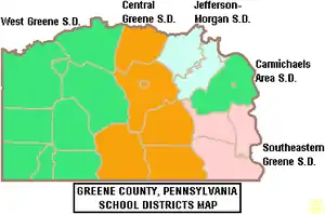 The Carmichaels Area School District serves the Borough of Carmichaels and Cumberland Township in Greene County, Pennsylvania. The district encompasses approximately 39 square miles (100 km2). The district is one of the 500 public school districts of Pennsylvania and one of five public school districts in Greene County. According to 2000 federal census data, it served a resident population of 7,120. By 2010, the district's population declined to 7,098 people.[1] In 2009, the district residents’ per capita income was $15,269, while the median family income was $36,276.[2] In the Commonwealth, the median family income was $49,501[3] and the United States median family income was $49,445, in 2010.[4] The educational attainment levels for the population 25 and over were 86.0% high school graduates and 18.6% college graduates.[5]