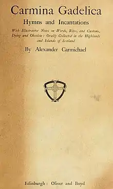 Carmina Gadelica is a compendium of prayers, hymns, charms, incantations, blessings, literary-folkloric poems and songs, proverbs, lexical items, historical anecdotes, natural history observations, and miscellaneous lore gathered in the Gaelic-speaking regions of Scotland between 1860 and 1909. The material was recorded, translated, and reworked by the exciseman and folklorist Alexander Carmichael (18321912).