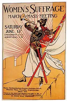 In 1908, Watts created the Artists' Suffrage League's promotional poster Bugler Girl for the National Union of Women's Suffrage Societies' June demonstrations.[3] The motif was thereafter made the logo of the suffragette newspaper and was copied frequently. It was also borrowed by the Women's suffrage in the United States movement and recoloured in purple, white and green.[4][5]