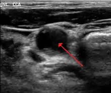 70 percent stenosis of the right internal carotid artery as seen by ultrasound. Arrow marks the lumen of the artery.