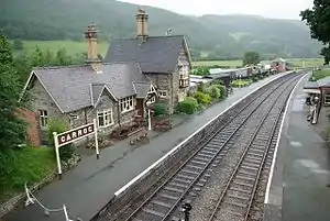 Carrog railway station in Denbighshire, Wales, was formerly a station on the Ruabon to Barmouth line. A camping coach was positioned here by the Western Region from 1956 to 1962.[2] It was to have closed to passengers on Monday 18 January 1965 but closed prematurely on 14 December 1964 due to flood damage. According to the Official Handbook of Stations the following classes of traffic were being handled at this station in 1956: G, P, F, L, H, C but there was no crane.[3]