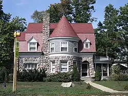 The Carroll Jones House is a two-story structure with both Dutch Colonial Revival and Romanesque Revival elements.[2] It has a large gambrel roof clad in red slate with green slate on the gable ends, and a round conical-roof tower in the front facade. The first floor is faced with massive hand-cut fieldstone blocks and contains a round porch with Tuscan columns.[6] The interior is decorated in Arts and Crafts style, with quarter-sawn oak doors, trim, and cabinetry.[2]