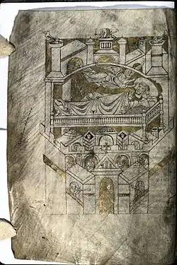 The original cartulary of the manuscript, dated to the middle of the 12th century, is decorated with several ornate initials: they are placed at the beginning of each charter. The letters are very little varied, as it is most often an "I" or "L", but each letter has a different decoration. The initials of the oldest part are black in colour, and contain fantastic animals mixed with interlacing: unicorns, billy goats, owls and werewolves, inspired by Physiologus or by folklore. Other initials are blue or red.[5] The manuscript also contains four miniatures covering all or most of their page:[6]