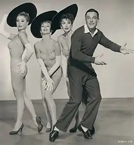 Four years later, Rita Hayworth wore a variation on the cartwheel made of sheer material to match the pleated Jacques Fath dress for her 'low key' wedding to Aly Khan – an event that generated huge interest and replica designs of her outfit.[10][11] By spring 1950, the cartwheel hat was being tipped in Life alongside pleated dresses as the: "new silhouette". The hat designs featured were also by Mr. John.[12] A month later, Life noted: "The recent tendency to go bareheaded has been reversed simply because the new season's narrow silhouette looks better when balanced with a hat." The article singled out the cartwheel in a new "unseasonal" coral velvet.[13]