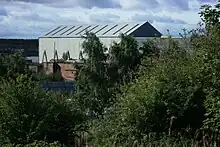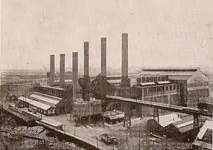 The station was designed by the British electrical engineering consultants, Merz & McLellan. The station's design set the pattern for power station layout and design for most of the early twentieth century, as it was the first in the world to use the "unit system" of layout, whereby each boiler and turbine generating set is directly connected electrically to an alternator, and can work independently from any other generating unit in the station. This system has remained popular throughout the twentieth century and into the twenty-first century.[1][4][5] The station's boiler houses and turbine hall were of steel frame construction clad with corrugated iron, with the boiler houses built at right angles to the turbine hall.[2] Each of the three boiler houses had its own chimney. This layout allowed for long lengths of steam-piping to be avoided, and for each battery of boilers to be arranged opposite the generating set which it feeds in the turbine hall.[1]