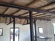 Wood pieces are placed atop of the poles to support the roof beams. Roofs were commonly constructed using maishi chiki (Sorghum bicolor), signalgrass (Brachiaria mollis), palmtree leaves (Arecaceae), or maize stems, locally referred to as chosa (before c. 1815).[16] This type of roofing is still found in Curaçao and Bonaire. Another method of roofing came in fashion in Aruba (after c. 1815), namely the whitening of these torto roofs. This method appears to have been introduced by groups of Spanish refugees who were expelled from Venezuela during the Venezuelan War of Independence and settled in Aruba.[2][14] These turtle-shaped roofs completely replaced the roofs covered with maize stems and are unique to these islands. To support the roof, roof rafters were installed on each pair of wall uprights, with a ridge height of approximately 1.20 metres (3.9 ft) and a roof pitch of around 50°. Fibrous skeletal strips of the candelabra cactus (Cereus repandus)[17] were utilized as roofing material. These cacti strips were either directly attached one by one to the rafters or first bound together with rope to create mats, which were then secured to the roof rafters. The outer surface of this cacti roofing was finished with the same torto used for the walls, and a final layer of white lime was applied.[14]