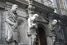 Casa degli Omenoni is a historic palace of Milan, northern Italy, located in the eponymous street of Via degli Omenoni (number 3).[1] It was designed by sculptor Leone Leoni for himself; he both lived and worked there. It owes its name to the eight atlantes decorating its facade, termed "omenoni" ("big men" in Milanese), which were sculpted by Antonio Abondio,[1] most probably on a design by Leoni.[2] Lions (a reference to the "Leoni" family)[3] are a recurring theme of its decorations; in particular, a large relief placed under the cornice depicts two lions tearing a satyr into pieces. The overall style of the palace and the decorations have been noted to include several references to the art of Michelangelo.[4] The internal courtyard, modified in 1929 by Piero Portaluppi, has a colonnade with metopes and triglyphs.