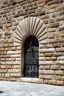 There are various entrances: the main entrance is formed by a large portal located on the west side, a second one is little more than a gate on the south side. Both are surmounted by a wreath of ashlar radials. Two Machicolation tailpipes loom above the entrances.