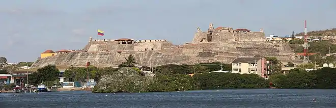 The Castillo San Felipe de Barajas (San Felipe de Barajas Castle) is a fortress in the city of Cartagena, Colombia. The castle was built in 1536 and is located on the Hill of San Lázaro in a strategic location, dominating approaches to the city by land or sea. It was originally known as the Castillo de San Lázaro. It was built by African slave labor under Spanish supervision during the colonial era.[1] The fortress was involved in several battles between the late 17th to early 19th centuries between European powers.
