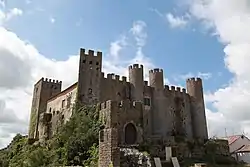 The trapezoidal castle oriented to the southeast rises 79 metres (259 ft) above sea level and is situated on the extreme northwest of the walled fortifications.[1] It is reinforced in the north by three semi-circular and rectangular corbels; in the east and west of the wall by rectangular corbels, known as the towers of D. Dinis and D. Fernando; to the south by two semi-circular corbels, one with machillitions; and a barbican in the north and west. Along the wall dividing the two courtyards is a gentle, rectangular arch, known as the tower of Albarrã.[1] The castle's architecture shows elements of Romanesque, Gothic, Baroque and Manueline influences spread over two main areas: the Castelejo (current Inn Castle, or Pousada de Obidos) and the intramural district.[1]
