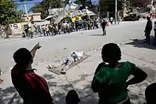 The looting and violence that occurred in the wake of the quake also led to casualties, including fifteen-year-old Fabienne Cherisma, who was killed on Marthely Seiee Street in Port-au-Prince when police fired shots to disperse looters.[94] Others identified as looters or thieves were killed by vigilantes.