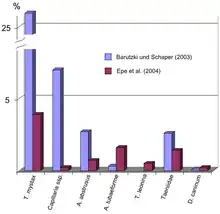 The frequency of infestation varies greatly depending on the worm species. In a German study of 3167 domestic cats, endoparasites were detected by flotation in 24% of the animals, with T. mystax showing the highest infestation rate at 26%.[17] Another study of 441 fecal samples detected T. mystax in only 3.9% of the samples, but again this roundworm was the most common parasite.[18] Infestation with T. mystax also dominates in Belgium,[19] the Netherlands,[20] the United Kingdom,[21] the United States,[22][23] Australia,[24] and Nigeria,[25] where infestation rates are as high as 60%. In Qatar, on the other hand, tapeworms (T. taeniaeformis: 76%, dipylidiidae: 43%) were mainly observed in stray cats, and T. mystax in only 0.4% of the animals.[26]