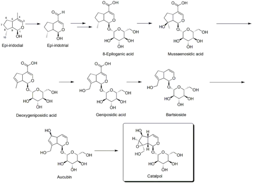 Though first isolated in the 1960s, there has been very little investigation of the biosynthetic pathway of catalpol.[5] S. R. Jensen has described a possible biosynthetic pathway for catalpol.[4] With iridoids stemming from a terpenoid origin, epi-iridotrial's precursor, epi-iridodial, is derived from geraniol.[8] Addition of a glucose at carbon 1 (C1) of the iridoid backbone and oxidation of the aldehyde at C4 of epi-iridotrial produces 8-epiloganic acid. A subsequent hydrolysis at C8 yields mussaenosidic acid, followed by a dehydration to yield deoxyngeniposidic acid. The next precursor, geniposidic acid, is furnished via hydrolysis of C10, and then a decarboxylation to remove the carboxylic acid at C4 provides bartsioside. The very widely known and accepted precursor to catalpol, aucubin, is then furnished via hydroxylation at C6. Finally an epoxidation with the alcohol at C10 yields catalpol.[4]