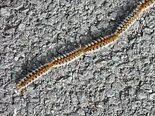 Some caterpillars are gregarious; large aggregations are believed to help in reducing the levels of parasitization and predation.[21] Clusters amplify the signal of aposematic coloration, and individuals may participate in group regurgitation or displays. Pine processionary (Thaumetopoea pityocampa) caterpillars often link into a long train to move through trees and over the ground. The head of the lead caterpillar is visible, but the other heads can appear hidden.[22] Forest tent caterpillars cluster during periods of cold weather.