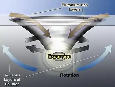 Among other ideal characteristics, the optimal shape for any fissile substance to become supercritical is the shape of least surface area, a sphere. Although the plutonium-rich solution was not spherical, the vortex made it thicker in the center, and this, along with the corresponding increase in density and the neutron reflectivity of the aqueous layer surrounding it, caused the dissolved plutonium to reach and cross the criticality threshold in approximately one second: neutrons within the mixture began to bombard the nuclei of the solution's plutonium atoms with sufficient frequency to cause these atoms to break apart and release other neutrons in a sustained nuclear chain reaction lasting only 200 microseconds but releasing a huge burst of neutrons and gamma radiation. Such an uncontrolled release of nuclear energy is often referred to as an excursion.[5] Within 3 seconds, the layers in the mixture had become dispersed, and no further excursions were possible.