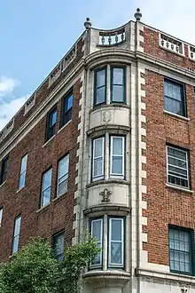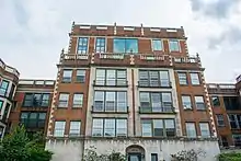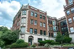 The building had a 335-foot (102 m) frontage on Cedar Glen Parkway, a 200-foot (61 m) frontage on Ambleside Drive.[33] The building's access road was set back 30 feet (9.1 m) from Cedar Glen Parkway, and the structure's east wall 20 feet (6.1 m) from Ambleside. Ample vacant land at the rear of the building provided privacy. The first floor of the Georgian Revival-style[37][39] building's exterior was clad in Indiana limestone, with the upper floors consisting of exposed brick with limestone trim at the corners[35] and around the doorways. The windows were trimmed with stone.[37] The building frame was steel, with walls, floors, and the roof of reinforced concrete.[36] The cornice was topped by a balustrade consisting of terra cotta balusters and a stone railing. Stone urns rested atop the balustrade.[37] The structure's exterior and interior masonry walls were certified by the Cleveland Clay League as using locally sourced materials, fireproof, and attractive.[40] The E-shaped building had a garden forecourt 75 feet (23 m) deep and 100 feet (30 m) long. The apartment complex itself consisted of a six-story central tower equipped with an elevator, and two four-story walk-up wings (e.g., equipped with stairs but no elevator).[35] Each wing, each connection, and the central tower all had their own entrances.[37] The building had an underground[33] 40-car garage[36] with internal staircases (so patrons did not have to exit the garage to reach the interior of the building).[35]