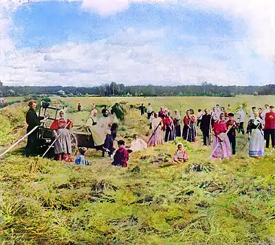 The differences in wealth and living standards of the peasantry between the central agricultural region and the surrounding agricultural areas were rooted in two factors, that is 'local differences in the quality of the soil', and 'historic legacies stretching back to the days of serfdom'.[7] Villages composed of former serfs were also less rich in land than those consisting of 'state peasants', i.e. peasants settled on land owned by the state. Orlando Figes cites the basic problem of the central agricultural zone being that 'the peasantry's egalitarian customs gave them little incentive to produce anything other than babies'; the birth rate in Russia at the second half of the 1800s were almost twice that of the European average, at about 50 to a 1000, with the highest rates in the lands with communal tenure, where the size of the family determined the size of land.[8] This population boom were due to land shortage: the population density of Central Russia matched Western Europe, with the average peasant allotment similar in size to those in Germany and France (at about 2,6 desyatina, roughly 1,1 hectare in 1900), but with only half the grain yield; this sharp difference from the rest of Europe was caused by the heavily outdated methods used by the Russian peasants in Central Russia: instead of the heavy iron plough low pulled by four to six horses in Western Europe, central Russian farmers often used a light wooden plough pulled by one horse or two oxen; they also used a small hand-sickle compared to the scythe or reaping hook which had been in use in Western Europe for over 50 years; sowing, winnowing and threshing was still done by hand compared to mechanised production in the rest of Europe; the use of chemical fertilisers were greatly below European standards; and advanced field rotations (alternative between cereals and root crops) were still largely unknown, while having been introduced in Western Europe in the mid-eighteenth century during the agricultural revolution.[9] To feed themselves more land was cultivated as few peasants had the money to modernise their farms, and this was accomplished by reducing the amount of communal pasture lands in the three-field system, which had the effect of reducing the livestock size and therefore also the main source of fertiliser, and exhausting the soil. By the end of the century one in three households did not own a horse, and had to either rent one or attach it to themselves and pull the plow themselves.[10]