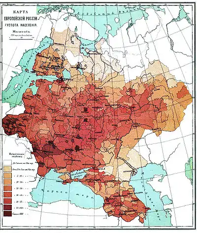 The Central Agricultural Zone was the main area of colonisation in the seventeenth and eighteenth century.[2] The centre of agricultural production moved to the region at the same time, and barschina emerged as principal peasant obligation. In these areas nearly 85 per cent of the serf population lived during the latter third of the seventeenth century.[15] At the time of the Emancipation, the Central Agricultural Region was one of the areas, alongside the 'black earth governorates' where the nobility wanted to free the serfs with as little land as possible (or none), and were willing to free their serfs without indemnification (or even a small one) if they were able to keep all of or most of the land for themselves.[16]