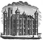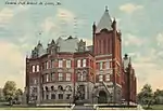 Designed by William Rumbold, the new building was built in 1855 at a cost of $50,000 at the corner of Olive and 15th streets.[9] The building had three full stories and a basement, nine classrooms, a 700-seat auditorium, and 16 smaller rooms used as libraries and wardrobes.[9] It initially was built with a capacity of slightly less than 500 students.[9] By 1859, course requirements for entrance had been developed, and two courses of study (general or classical) were available to students.[9]