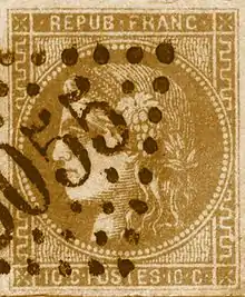 At the same time, in Bordeaux, where the provisional government fled, the printing of Ceres stamps was authorized from the 5 November 1870 to the 4 March 1871 to supply the post offices of non-occupied France. The stamps were printed in lithography (instead of typography) by Augée-Delile. Because of this choice, stamps differ repetitively from one another.[3]