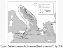 According to Heyd (2013) and Maran (1998), Cetina people from the Adriatic region migrated into southern Greece at the transition from Early Helladic II to III, c. 2200 BC. This explains the appearance of Bell Beaker artefacts in mainland Greece, Crete and the Aegean at this time.[4] Kristiansen and Larsson (2005) suggest that migrants from both the Adriatic Cetina culture and the Danube area reached Greece in this period, the latter indicated by close similarities in pottery forms to the Mokrin and Nagyrev cultures. According to the authors there were "movements of groups of traders and some whole communities from east central Europe and the Balkans into Greece and the east Mediterranean at the close of the third millennium BC along already established routes of contact."[5] Galaty et al. (2015) similarly argue that a 'warrior culture' including "ideas related to warrior aristocracy" spread from Europe to Greece through contact with the Cetina culture, along with the tradition of tumulus burial.[6]