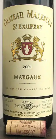 Château Malescot St. Exupéry is a winery in the Margaux appellation of the Bordeaux region of France. The wine produced here was classified as one of fourteen Troisièmes Crus (Third Growths) in the historic Bordeaux Wine Official Classification of 1855.[1] The vineyards are planted with 50% Cabernet Sauvignon, 35% Merlot, 10% Cabernet Franc and 5% Petit Verdot, at a density of 10,000 vines/hectare, with an average age of about 35 years. A second wine is also produced, La Dame de Malescot.
