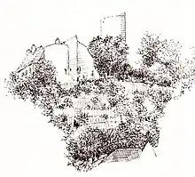 The castle dominates the town of Châlus. It consists today of an isolated circular keep (12th century) and a residential building constructed between the 11th and 13th centuries, enlarged in the 17th century.[1]