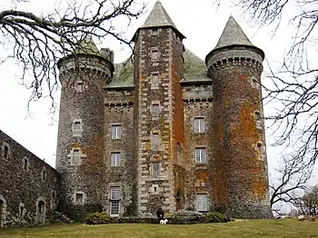 The castle, which belonged for four centuries to the Roquefeuil-Blanquefort family, comprises six towers (two hexagonal in the middle of the two front and rear facades, four rounds at each corner). The central tower of the south facade, which contains the staircase is pierced on the ground floor of a radiating Gothic door. The typically feudal and defensive character of the castle is somewhat mitigated by the existence of later windows on the three floors. The defensive system which surrounded it (enclosure, ditch, fortifications) disappeared, replaced by two wings in the 17th century. Inside, the ground floor has kept its kitchen intact, with the mesh stage where the musicians were based. The chapel retains a decoration painted by Debert in 1709.[2]