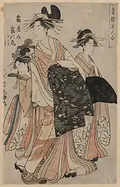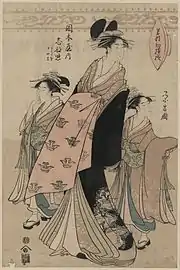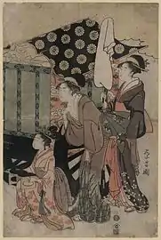Eishō's work is assumed to have been in competition with that of Utamaro, who was known for his vertical ōkubi-e bust prints in the bijin-ga genre of portraits of beautiful women.[1] Most of Eishō's prints were in the same format.[1] He depicted his subjects in an elegant, slender-proportioned style.[2] His most representative prints are considered to be those from the series Kakuchū bijin kurabe (郭中美人競, "Contest of beauties in the pleasure quarters", c.1795–1797). The series depicts actual courtesans from the Yoshiwara pleasure quarters, and the backgrounds were treated with glimmering mica.[2] Eishō contributed twenty of the twenty-four print designs; the remainder were by fellow Eishi students Eiri and Eiu.[1]